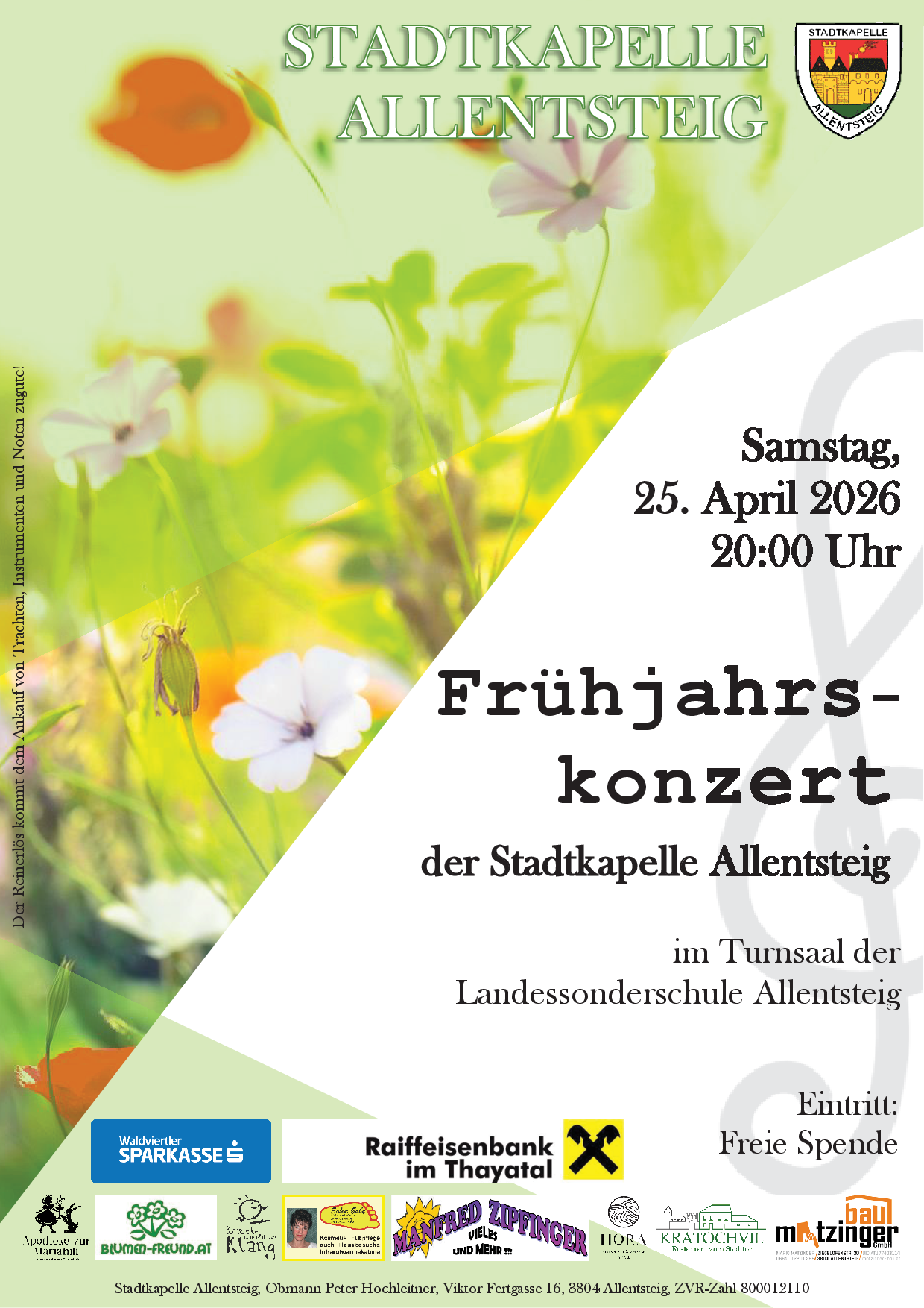 Wir dürfen Sie herzlich zu unserem diesjährigen Frühjahrskonzert einladen, und zwar am Samstag, den 25. April um 20:00 Uhr im Turnsaal der Landessonderschule Allentsteig.